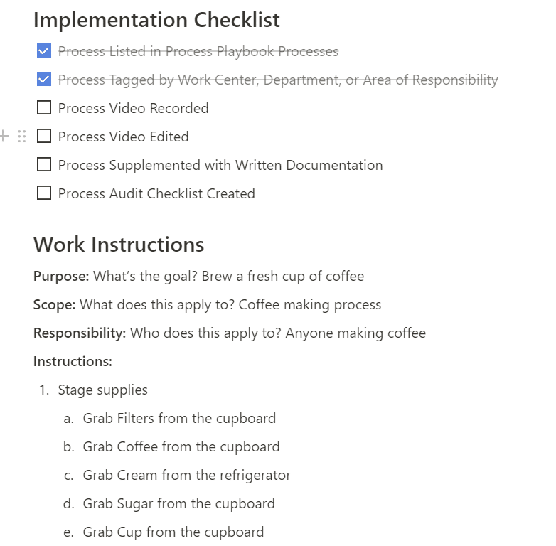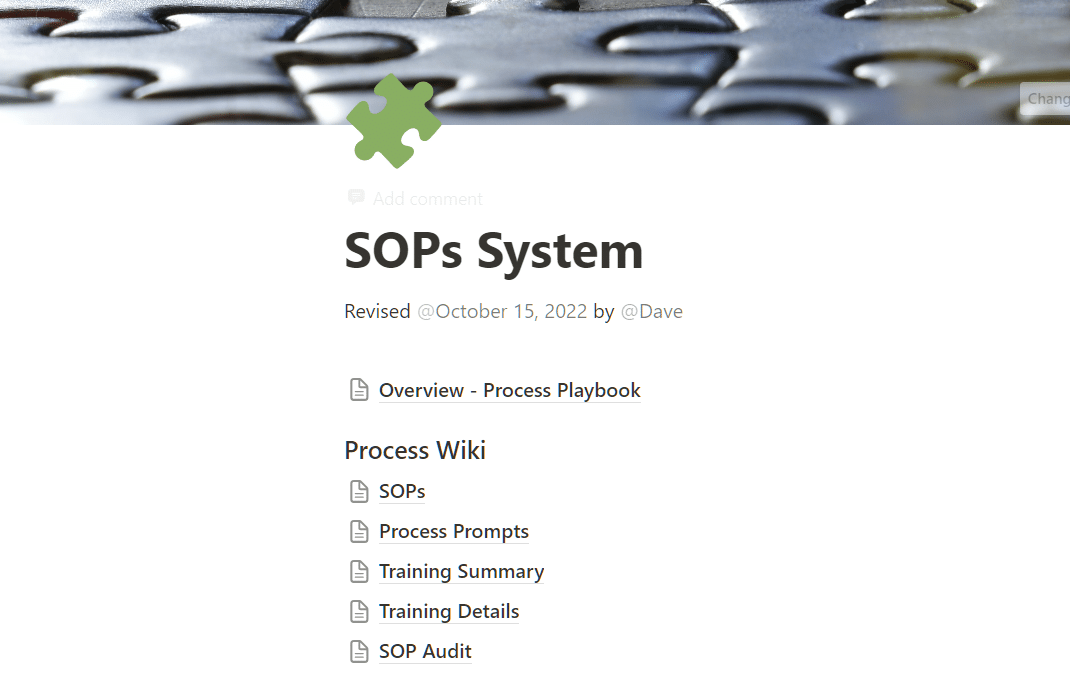 The SOP Management System we currently use to accomplish this for ourselves and our clients is built out in a tool called Notion, but you can easily create a system that accomplishes this using several other technology platforms.